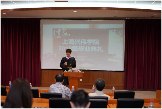 报告厅门口矗立的典礼会标“上海乐鱼网页版页面登录2018级毕业典礼”在淡蓝色背景衬托下,显得典雅庄重;橙色的毕业口号“自由、激情、致青春”像星星般点缀在会标下,伴着仙人掌花瓣,闪闪发光,让会标显得活泼可爱,如同毕业生们正蓬勃向上、灿烂燃烧的青春。2019级学生卢楚韬、阚晨主持典礼。